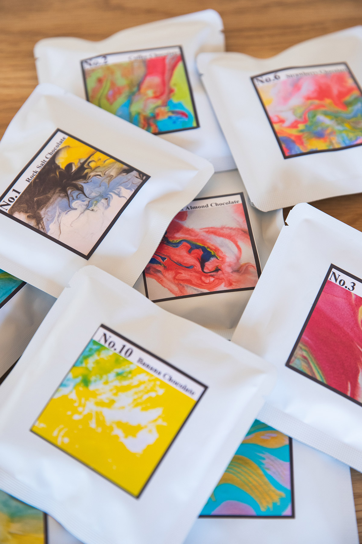 機械生産ではなく、手作業で作られたひとつひとつ形の違うチョコレートは、それぞれに個性が宿り、すべての表情が異なります。チョコレートの製造からパッケージングまでの全てをショコラボのスタッフで担い、柔らかなカラーが印象的なパッケージも、ショコラボのスタッフの方がマーブリングによって創り上げたデザイン。